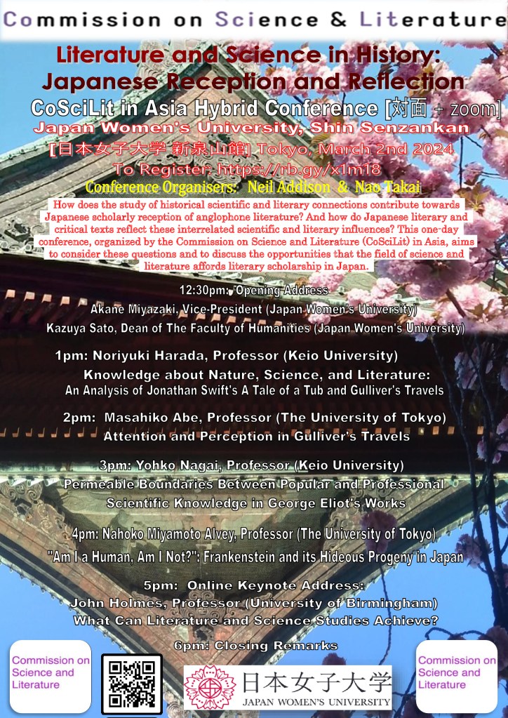 How does the study of historical scientific and literary connections contribute towards Japanese scholarly reception of anglophone literature? And how do Japanese literary and critical texts reflect these interrelated scientific and literary influences? This one-day conference, organized by Japan Women’s University (JWU), Tokyo, and the Commission on Science and Literature (CoSciLit), aims to consider these questions and to discuss the opportunities that the field of science and literature affords literary scholarship in Japan. The event brings together research by leading Japanese scholars of anglophone literature and concludes with an online address by CoSciLit Global President Professor John Holmes. To register your (online or in person) attendance please go to: https://rb.gy/x1m18